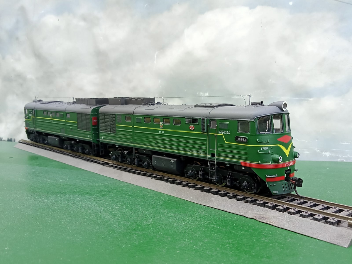 Представляю Вашему вниманию модель тепловоза ТЭ3-6453 приписки Октябрьской железной дороги в "северном" варианте исполнения, автором которой является Юрий Якуб. Модель выполнена в масштабе 1:87 (типоразмер Н0). На изготовление модели было потрачено полмесяца, работы стартовали 30 сентября 2022 года, а закончена модель была буквально сегодня, 14 октября. Миниатюрная копия тепловоза собрана из кита производства Олега Волузнева, детали кита выполнены из пластика. Использована ходовая часть производства А. Локшина. Реализовано раздельное включение прожектора, буферных фонарей, красные сзади, свет в кабине, свет в дизельном помещении, подкузовное освещение, тифон, свисток, режим отключения "плавного замедления". Для сцепления секций используется динамический механизм. Дополнительно применены детали из травленой латуни производства ARtModel - ободки прожекторов, "очки" на буферных фонарях, дворники, площадки на передних скобах, двухрядные жалюзи, вертикальные жалюзи. Надписи на модели выпол