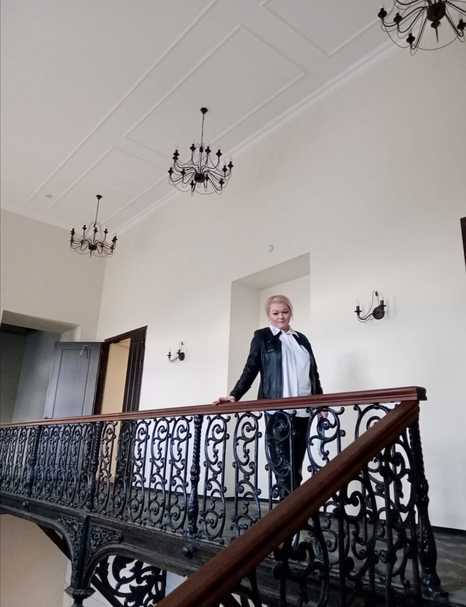 На второй этаж вела ажурная, практически воздушная лестница. Несмотря на всю надежность конструкции, лестница казалась легкой и хрупкой, как паутинка. На фото видны только перила, не додумались с женой клиента сами ступени "захватить". Это я тоже исправлю, если удастся еще раз попасть в этот суд. Увидев лестницу, "люстры" и светильники в коридорах я еще тогда подумала, что дом этот явно не Советских годов постройки-планировки. Будто какой купец себе хоромы строил)