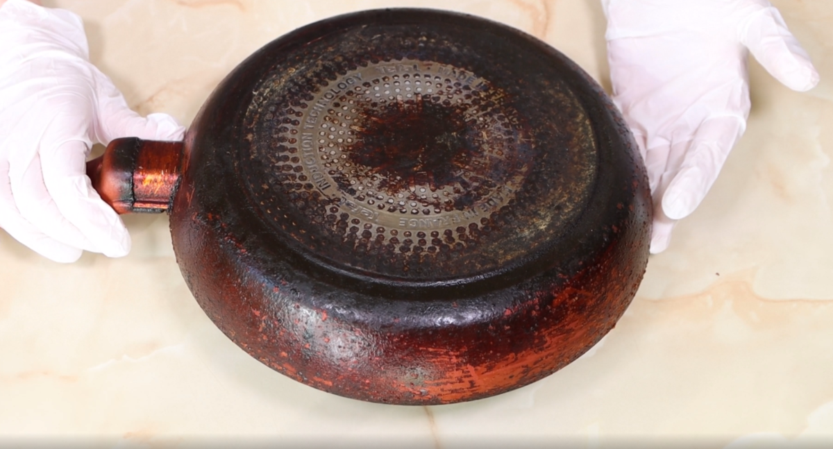 Возьмите немного нашатырного спирта и налейте его на сковороду руками в перчатках, распределив по всей поверхности.