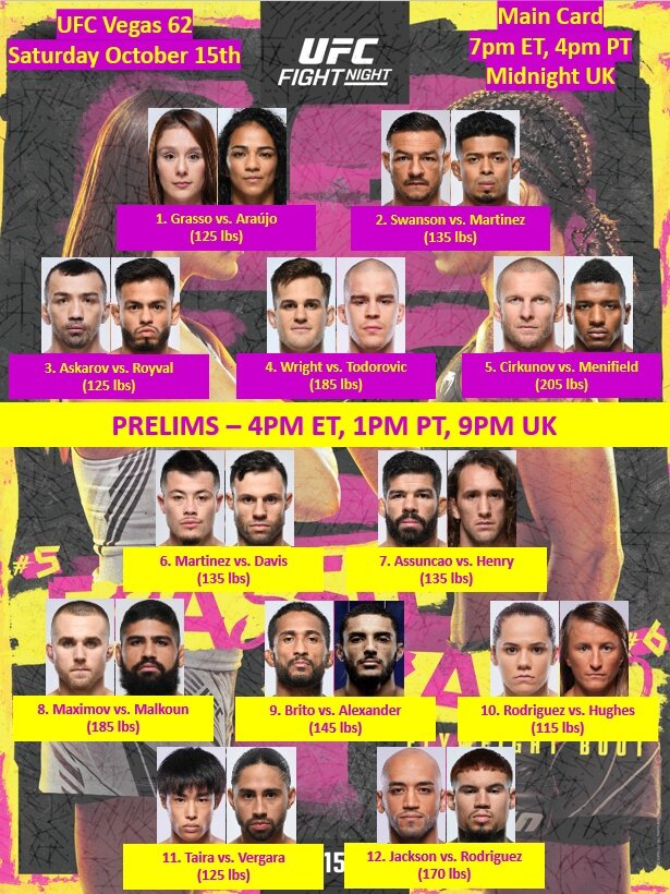 📊UFC Vegas 62 Основной кард UFC 👊Алекса Грассо против Вивиан Араужо 👊Джонатан Мартинес против Каба Суонсона 👊Аскар Аскаров против Брэндона Ройвала ОТМЕНЕТ 👊 Душко Тодорович против Джордана Райта 👊Миша Циркунов против Алонсо Менифилда 👊Брэндон Дэвис против Мана Мартинес 📊UFC Vegas 62 Прелимы UFC 👊Лукас Александр против Джоандерсона Брито 👊Джейкоб Малкун против Ника Максимова 👊Рафаэль Ассунсао против Виктора Анри 👊Сэм Хьюз против Пьера Родригес 👊Тацуро Тайра против Си Джей Вергара 👊Майк Джексон против Пита Родригеса