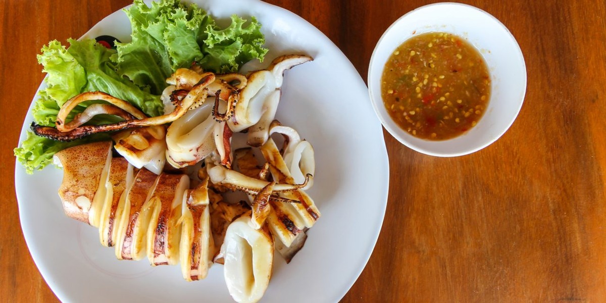 Разделить булгар по 4-м тарелкам, положить сверху чоризо и кальмаров и побры