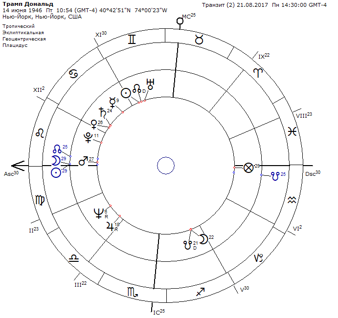 Само слово затмение наводит страх и трепет на человека с незапамятных времён. А уж если затмение выпадает на градус натального асцендента - панической релокации в края обетованные готовы поддаться даже скептики и стоики. По поводу релокации - «от себя не убежишь», и натальный асцендент со всей его прогностикой последует за вами через любой кордон. Да и края заморские может статься обетованны совсем не вам. А вот "черт" по здравому размышлению и внимательному рассмотрению оказывается не только не страшным, но даже прекрасным ... шансом и отличной возможностью. Если смело засучить рукава и бороться за светлое будущее. Дональду Трампу посчастливилось родиться аккурат за несколько часов до затмения. Несложно представить, каких страшилок предрек бы древний астролог такому младенцу). Однако по факту младенец не только выжил, но и достиг самых высоких финансовых и карьерных высот в этом мире, забравшись на верхнюю ступень социальной лестницы и заняв президентский пост могущественнейшей миро
