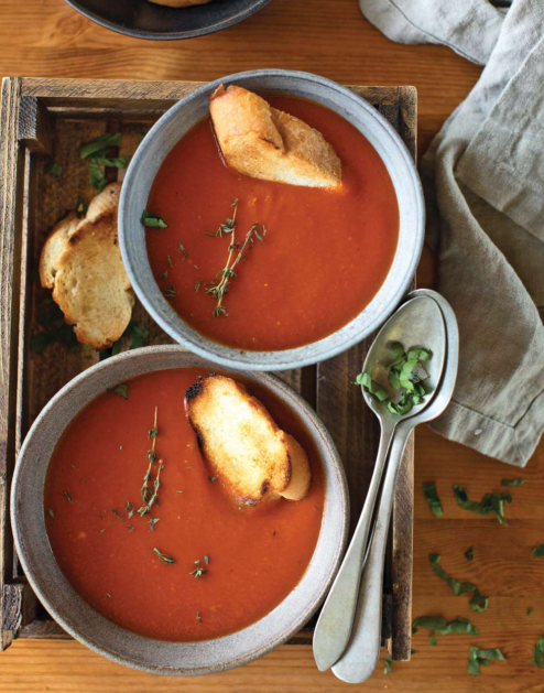 Ингредиенты: Для гренок: Приготовление: 1. Разогреть духовку до 200 градусов в режиме конвекции. 2. Овощи помыть, обсушить, сбрызнуть маслом и запечь в разогретой духовке 25-30 минут до коричнево-черного цвета. 3. Багет нарезать на ломтики, сбрызнуть оливковым маслом, солью, перцем, сухим чесноком. Поставить в разогретую духовку на 3-5 минут. Готовые гренки достать и сохранить для супа. 4. Перец переложить в целлофановый пакет и плотно завязать либо положить в кастрюлю и накрыть крышкой. Остудить в течение 10 минут, чтобы кожица отошла. 5. Очистить перцы от кожицы. Картофель, помидоры, чеснок и лук очистить от кожуры. 6. Сложить овощи в кастрюлю, залить водой, довести до кипения. Пробить блендером, добавить соль, перец молотый, тимьян, паприку и сахар. Готовый суп снять с огня и дать настояться 5-7 минут. 7. Подавать суп с гренками, украсить зеленью, семечками, оливковым маслом или тертым сыром по желанию. Приятного аппетита!