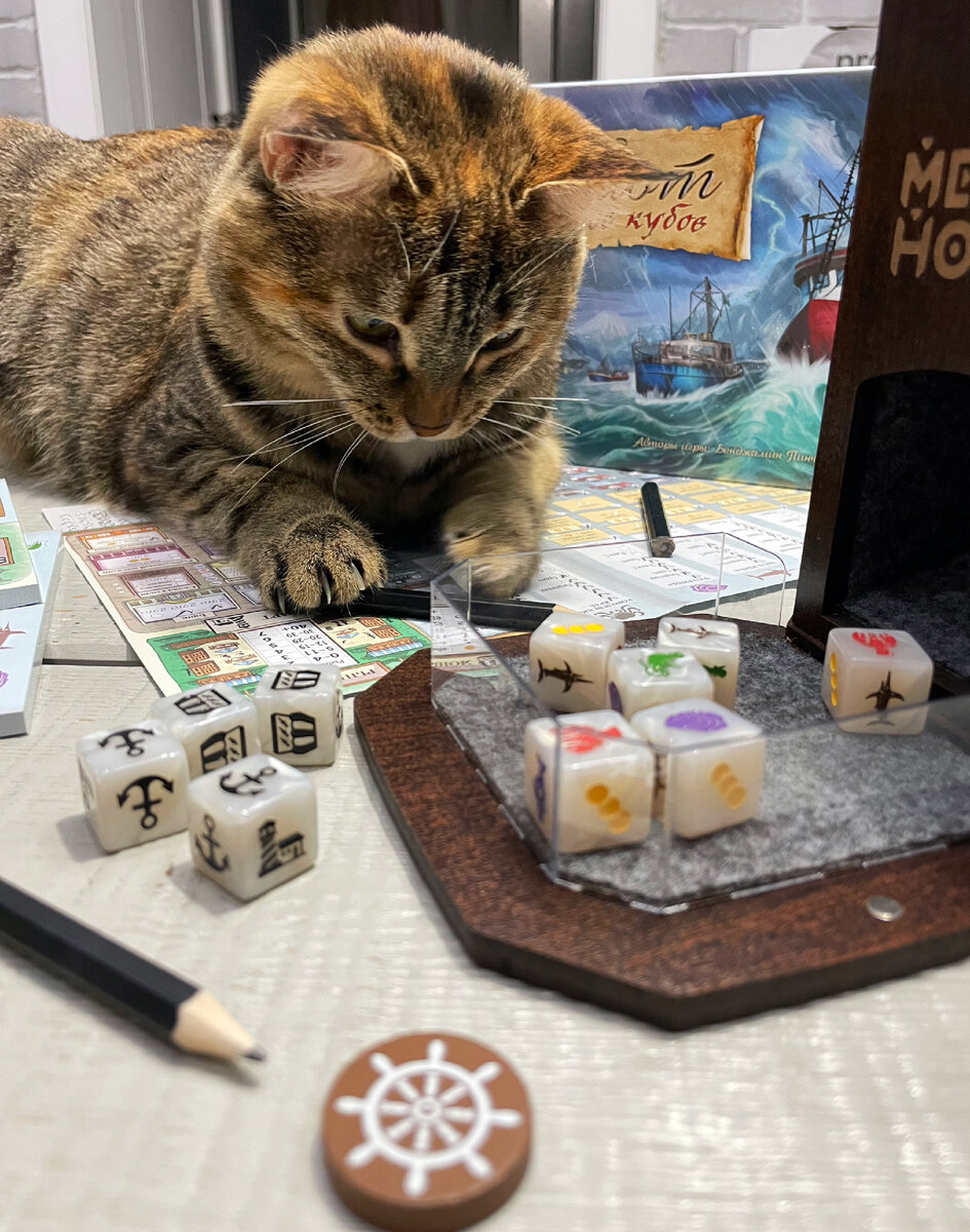 А ещё Виталя правильно заметил, что «Флот. Улов кубов» — возможность взять полноценную и довольно глубокую игру в дорогу и не испытывать от этого неудобств — уверена, что играть в поезде в неё, например, можно без особых проблем. В коробке русской версии сразу есть карандаши, но я бы рекомендовала ещё на всякий положить ластик, пригодится — мало ли где вы просчитаетесь в первых партиях, у меня такое бывало.