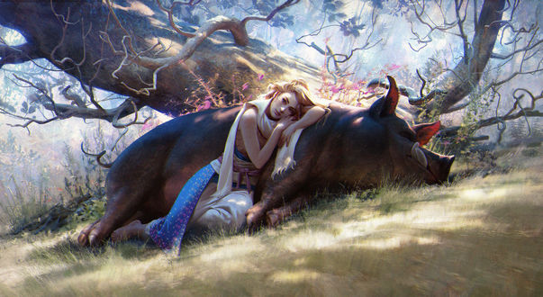 Каково же было всеобщее удивление, когда из кареты вышла девица, а следом выпрыгнул вепрь и встал рядышком, точно верный пёс.
