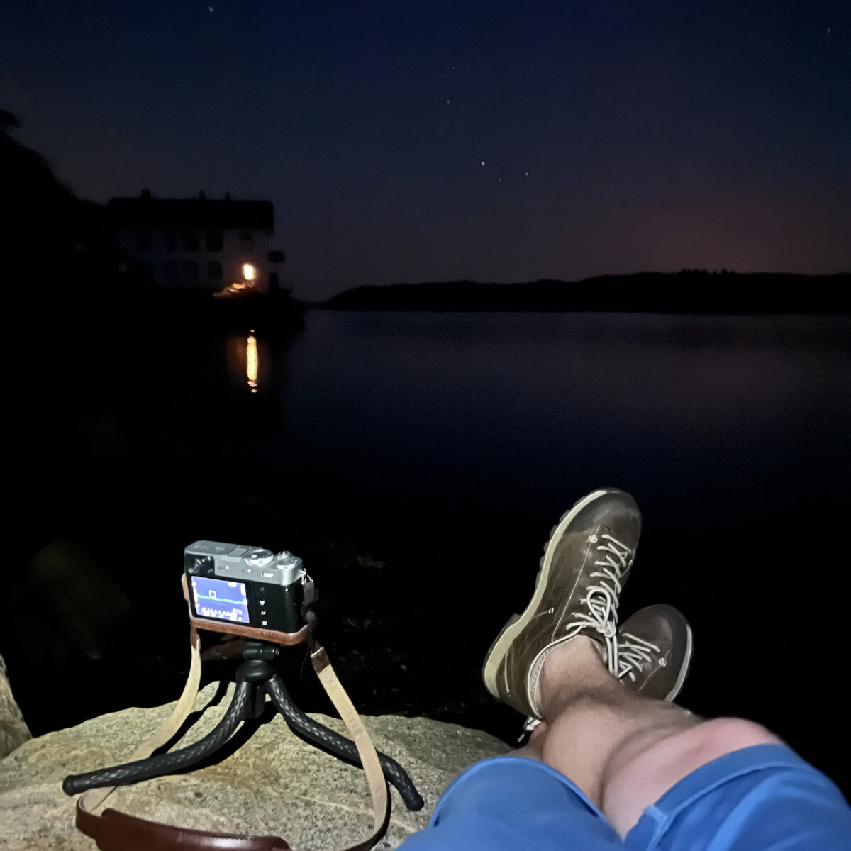 Недавно я попробовал поснимать ночной пейзаж со звёздами на камеру своего телефона. Было это во время обычной пейзажной съёмки (не на телефон, а на нормальную камеру): Мне было скучно ждать пока закончится серия из нескольких фотографий (часто в ночном пейзаже делают несколько снимков, для того, чтобы их потом склеить в редакторе). Поэтому я решил посмотреть, как справится с ночным пейзажем камера моего iPhone 13 mini. В стандартном приложении "камера" есть функция ночной съёмки, и если вы постараетесь держать телефон неподвижно в течение нескольких секунд, то сможете снимать даже при очень тусклом освещении. Вот что у меня вышло. Когда я увидел результат на телефоне, то был приятно удивлён, так как был уверен, что камера телефона совсем не справится с такой задачей. Однако на фото мы можем разглядеть и млечный путь и детали дома. На большом мониторе, к сожалению, эта фотография выглядит значительно хуже, с шумами неприятными артефактами: Вот для сравнения то, что получилось на мою о