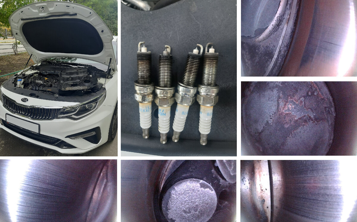 Автомобиль : KIA OPTIMA. Год выпуска : 2019. Маркировка двигателя : G4KD. Объём двигателя : 2.0 (150 л.с.). Тип топлива : бензин. Блок двигателя : алюминиевый с чугунными гильзами. Заявленный пробег : 118000км. Проверку заказал собственник. УДАЛИМ КАТАЛИЗАТОР БЕСПЛАТНО! - звучит сегодня практически из каждого "утюга". Купил человек новое авто, ездил, бед не знал, ездил бы и дальше, но, реклама, к сожалению, делает свое дело. Решился удалить катализатор, чтобы продлить жизнь мотору. Сказано - сделано. Проезжает примерно 2000 км., замечает, как на ходу, на кочке, загорается контрольная лампа давления масла (кто не в курсе, на этих машинах датчика уровня масла нет, а контрольная лампа загорается тогда, когда масла НЕТ ВООБЩЕ). Сворачивает к обочине, проверяет уровень, а там СУХО. Долил, поехал дальше. Покатавшись еще примерно 1000 км. понял, что масло быстро уходит, при том, что до этого его хватало от замены до замены. Заказал услугу "эндоскопия двигателя". Осмотр показал - мотор готов!