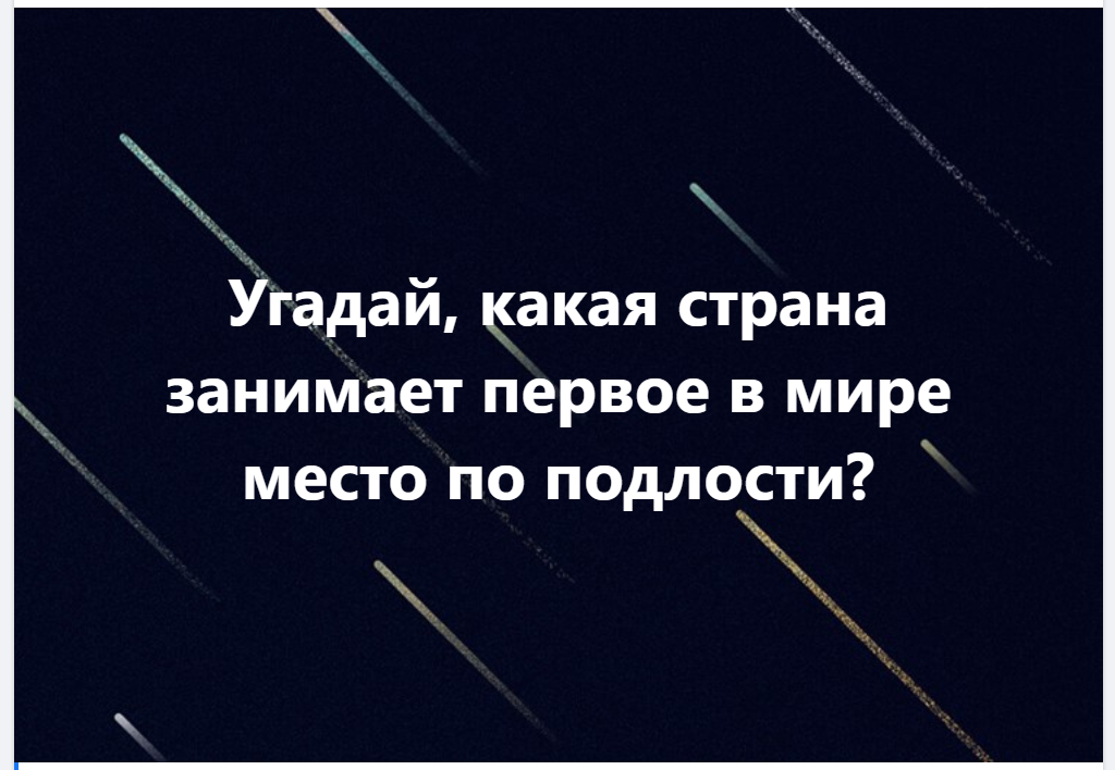 https://www.facebook.com/serkova.natalya/posts/pfbid02vdfS9CCqJ913n4fP6RksCf9LH25Qo4awncA1ns5GZgWgfmrG5vymjcnLUoLsXtVWl Угадай, какая страна занимает первое в мире место по подлости?