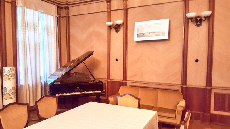Э: Здесь находится рояль XIX века царской семьи Романовых. В 46-ом году по инициативе Сталина рояль привезли сюда из Зимнего Дворца Санкт-Петербурга. Сам Сталин на рояле не играл.