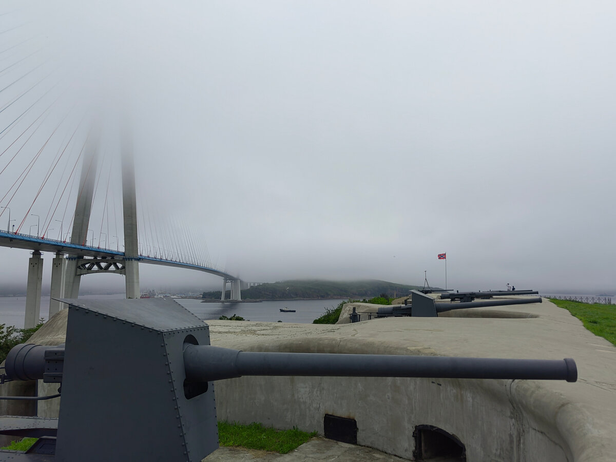 В один из дней нас повезли на остров Русский, расположенный в Заливе Петра Великого Японского моря. Мы проехали по знаменитому вантовому мосту самому длинному в мире. Этот мост многие из нас неоднократно видели по телевизору. Очень впечатляет! Но, одно дело видеть картинку в репортажа корреспондентов и совсем другое восприятие, когда едешь по этому удивительно у сооружение на автобусе. На о. Русский сейчас находятся восстановленные форты (один из которых с белым пианино на обрыве скалы),