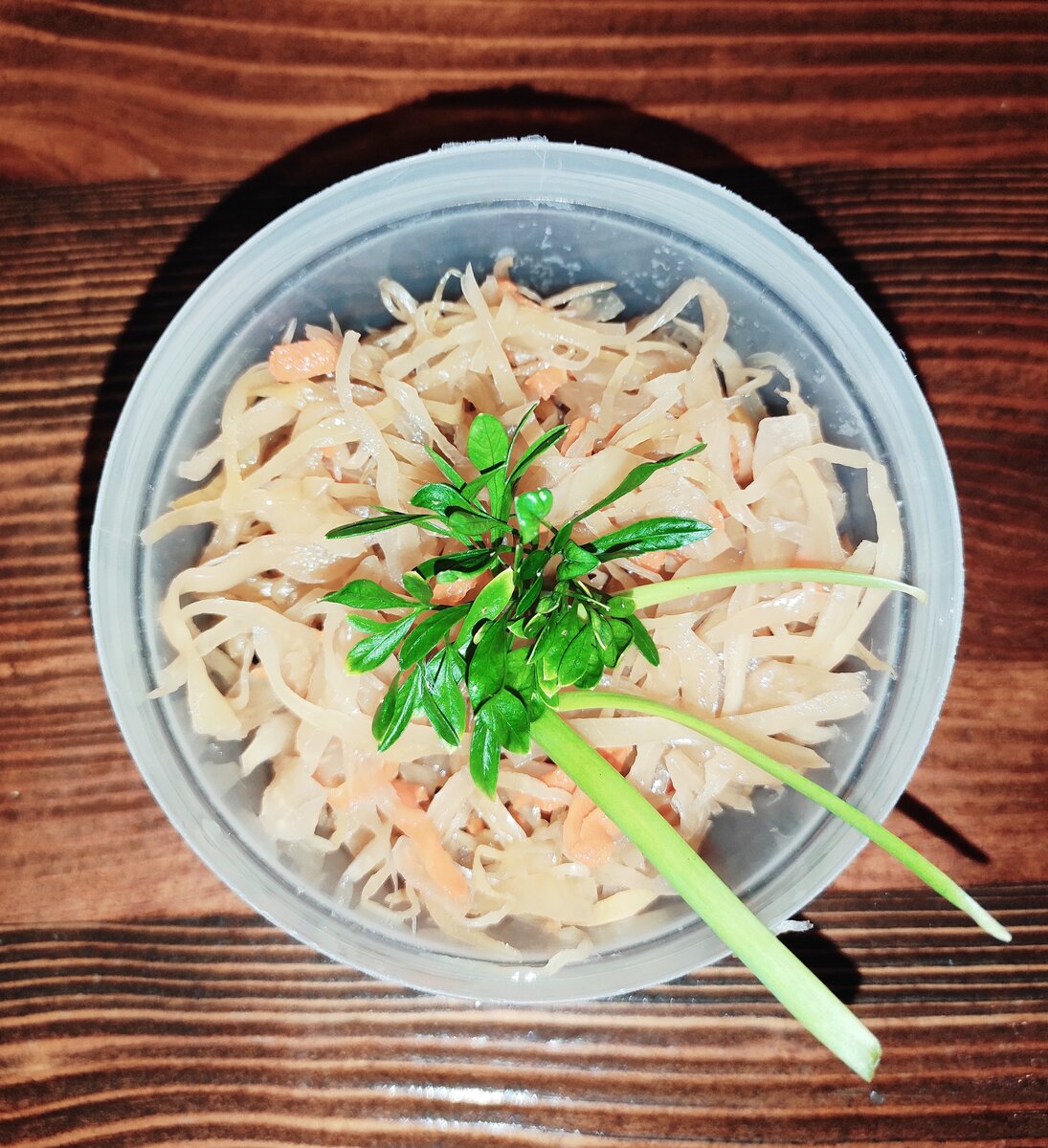 Так как я готовлю капусту ведрами, то в ноябре я ее ставлю (два ведра) между дверей, там как раз в этот момент уже холодно. Моя капуста стоит между дверей до марта, а когда становится тепло, остатки перекладываю по банкам и убираю в холодильник. Если капуста между дверей замерзнет, ничего страшного с ней не будет, я отковыриваю ее ножом, сколько надо на еду, и ставлю в тёплое место на разморозку, вкус от этого не теряется совсем. Конечно, в стеклянной банке капусту замораживать нельзя, так как банка может лопнуть.