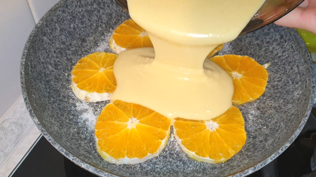 Здравствуйте, дорогие друзья. Порой магазинные торты оставляют желать лучшего, а это тонкий намек на то, чтобы приготовить что-то восхитительное своими руками. Как насчет апельсинового торта? Не пробовали? Нужно быстренько восполнить этот пробел! Мои домочадцы без ума от цитрусового лакомства, и просят испечь его чуть ли не каждую неделю. Охотно делюсь с вами своими секретами, вперед! Нам нужно: Для теста: Очистив наш апельсин, режем его колечками. Теперь пришла пора готовить тесто, разбиваем яйца в миску, затем добавляем сахар, соль, ванильный сахар, основательно взбиваем венчиком. Пришло время залить стакан теплого молока, любой жирности, и вновь повторяем процедуру смешивания. Сеем стакан муки, и наше тесто после помешивания приобретает уже понятную форму. 🍳На раскаленной сковороде, смазанной маслом, рассыпаем немного муки, выкладываем на нее наши апельсиновые колечки. Настало время залить все это дело тестом. 🎂Держим наш будущий торт 15 минут на медленном огне, после этого накрыв