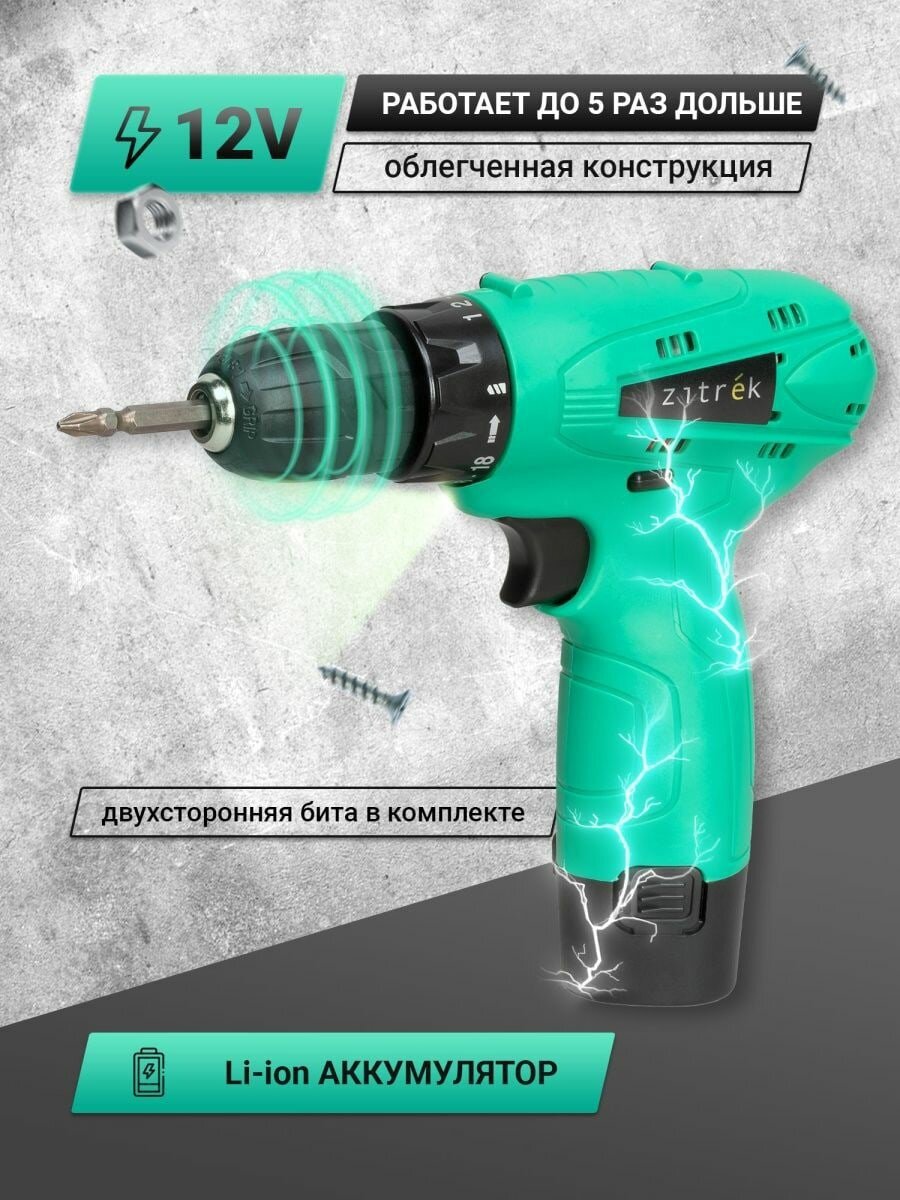 1. Аккумуляторная дрель - шуруповерт Zitrek Green 12 (12В, Li-ion аккумулятор, бита)