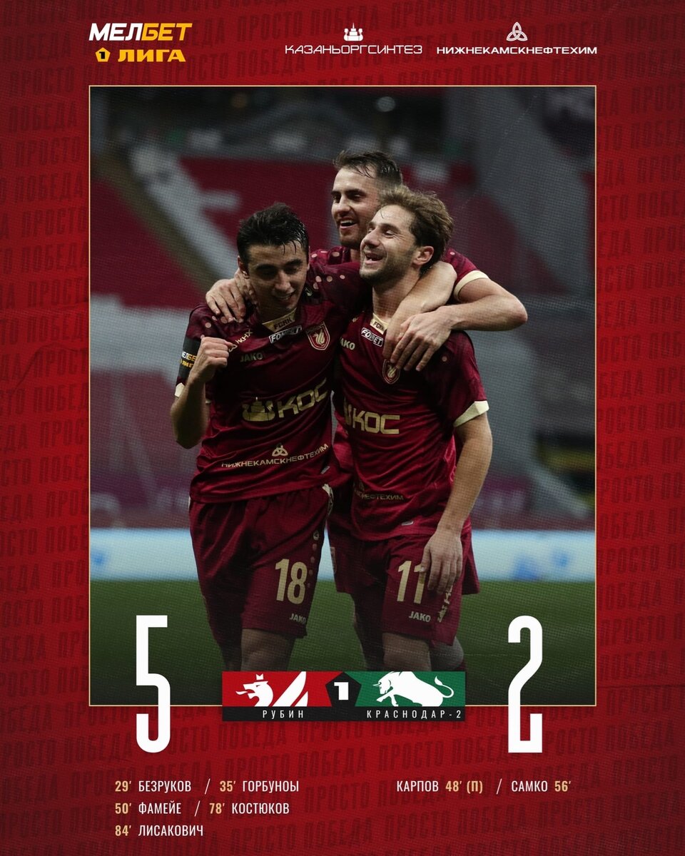 Казанский "Рубин" дома разгромил вторую команду "Краснодара" в матче 14-го тура российской ФНЛ — 5:2. У хозяев белорусский защитник Александр Мартынович отыграл без замены, форвард Виталий Лисакович вышел на поле на 81-й минуте и забил последний мяч своей команды на 84-й. Команда Леонида Слуцкого с 25 очками идет четвертой в таблице. Рубин — Краснодар-2 — 5:2 Голы: 1:0 — Безруков (28). 2:0 — Горбунов (35). 2:1 — Карпов (48, с пенальти). 3:1 — Фамейе (49). 3:2 — Самко (56). 4:2 — Костюков (78). 5:2 — Лисакович (83). Фото: vk.com/fcrk