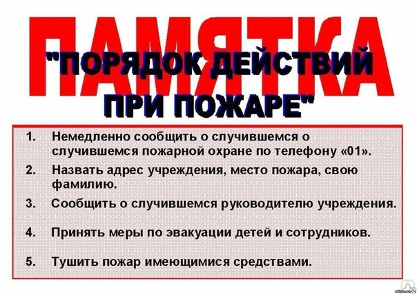 В случае пожара, действия работников организации и привлекаемых к тушению лиц в первую очередь должны быть направлены на обеспечение безопасности людей, их эвакуацию и спасение. Каждый работник организации, обнаруживший пожар и его признаки (задымление, запах горения или тления различных материалов, повышение температуры и т.п.) обязан: немедленно сообщить о пожаре в пожарную охрану по городскому телефону по номеру «01» или по мобильному телефону по номеру «112» (при этом необходимо четко назвать адрес организации, место возникновения пожара, а также сообщить свою должность и фамилию); известить о пожаре руководителя организации или замещающего его работника; задействовать систему оповещения людей о пожаре, приступить самому и привлечь других лиц к эвакуации из здания в безопасное место согласно плану эвакуации; при необходимости отключить электроэнергию, приостановить работу отдельных агрегатов и участков, способствующих развитию пожара и задымлению помещений здания; оценить обстановк