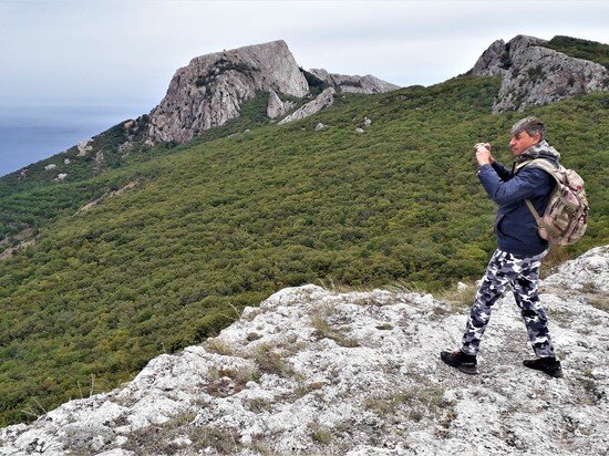Вершинный купол горы Челеби по форме близок к сферическому. На севере просматривается часть Байдарской долины, коттеджный поселок Кизиловое с полноводным ставком. Чуть дальше видно озеро Золотой Поляны и околица села Орлиного. На юге угадывается полоска моря под грозовыми тучами. Но округлость вершины не позволяет увидеть береговую черту. За такой красотой придется немного спуститься к обрывам. Хорошо виден маяк мыса Сарыч, телевизионный ретранслятор, дача «Заря», форосский парк и санаторий. Тучи заметно движутся со стороны моря и обещают нам дождь. Приходится ускорить шаг. На западе нам открывается стена горы Ильяс-Кая. На предвершинном гребне четко видна группа туристов. А вот скалы Тышлар, недавно окрещенные как Храм Солнца, почти не видны из-за складок местности. На опушке редкого леса можно встретить дикую яблоню и грушу. Под этими деревьями заметны следы кабаньего пиршества. Поляны перепаханы будто плугом. Такая же картина и в зарослях дуба с обильным урожаем желудей. Возле вершины встретили стаю пустельг, которые старательно высматривали в траве мышей. Птица эта хоть и не велика по размеру, но отличается чрезвычайной зоркостью. Удивляет осеннее разнотравье на яйле. Желтые, синие, малиновые цветы напоминают скорей майские луга, нежели сентябрьские поляны.