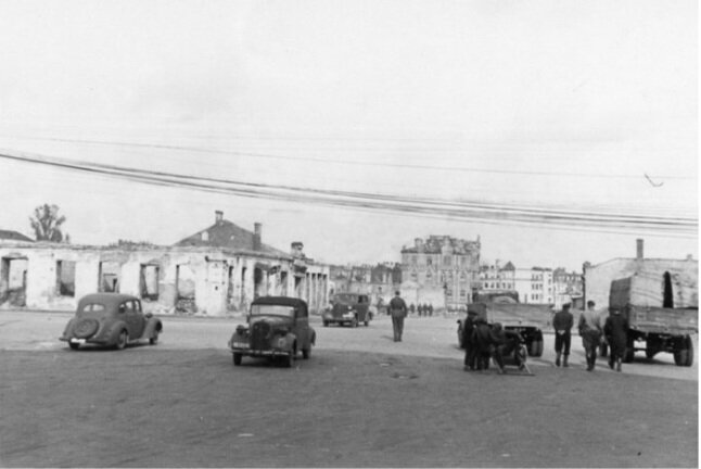 Наиболее узнаваемым символом Минска, его главным открыточным видом, так сказать, столичным брендом. Башни на Привокзальной площади используются и в логотипах, и в рекламе, печатаются в газетах и даже учебниках. Из послевоенной неоклассической застройки и они больше всех по душе, нравится эта бескомпромиссная монументальность, безупречные пропорции и размах в целом. К сожалению, о проекте известно не очень много, а фотографий периода строительства исчезающе мало. Известно, что Привокзальную площадь Минска планировали перестраивать еще до войны – уж слишком она была непрезентабельная и низкорослая для быстрорастущей белорусской столицы. О том, какой она планировалась, мничего не известно, но точно известно, что бои за город и оккупация нанесли тяжелый урон местности. Снимок, вероятно, сделан летом 1941года, когда Минск был занят нацистами. Фотообъектив смотрит на створ будущей улицы Кирова и будущих же “ворот”, ориентиром здесь выступает здание Алексеевской гимназии, ныне суда ЕврАзЭС: