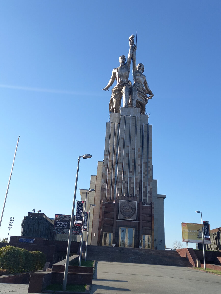 Заканчиваются последние тёплые и солнечные деньки в Москве. И мы активно пользовались этим прощальным подарком осени. А впереди, судя по прогнозам, дожди, дожди … И вот гуляя всем семейством возле ВДНХ, оказались в непосредственной близи от знаменитого памятника советского скульптора Веры Мухиной «Рабочий и колхозница»,изготовленного в 1937 году для советского павильона на Всемирной выставке искусств и техники в Париже. Очень часто проезжали мимо монумента, но никогда не проходили мимо него. А тут не просто прошли, поглазев на скульптуру, но ещё и посидели на скамейке прямо напротив входа в музей памятника, расположенный в его постаменте, и рассмотрели, наконец, некоторые детали всей композиции. Сидели и разглядывали, задрав головы, две массивные фигуры, символизирующие единение советского пролетариата и крестьянства. И дочка задала вопрос про странные, как ей показалось, одежды мужчины и женщины. А и правда, подумалось, что может значит эта несколько излишняя анатомичность фигур, не