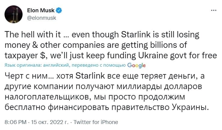 Илон Маск заявил, что будет финансировать проект Starlink в Украине. Ранее, он просил Пентагон взять все расходы на себя.