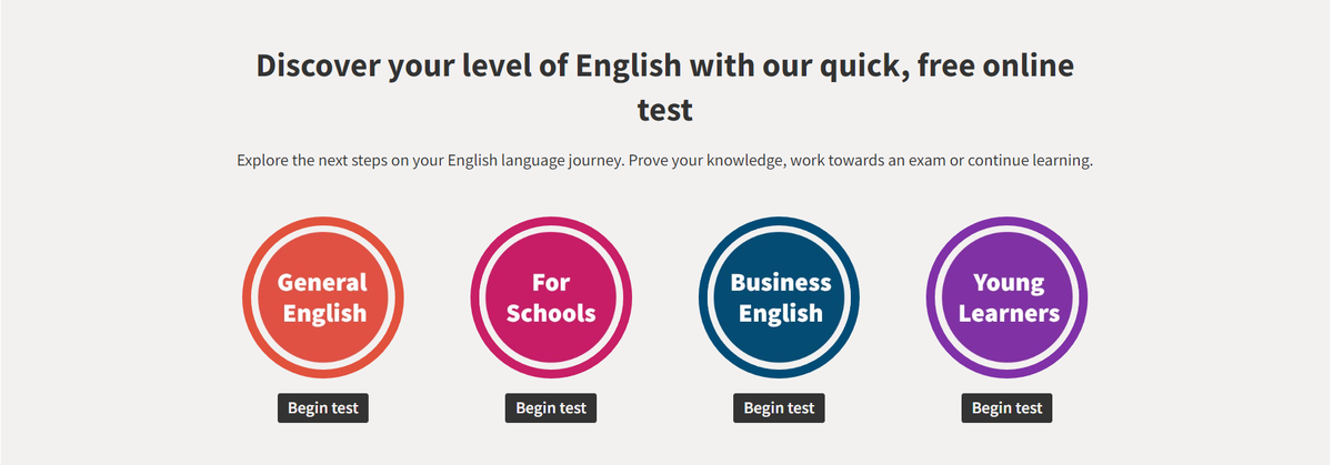 Иногда на пути изучения языка могут возникнуть трудности из-за незнания своего уровня. Может сложиться впечатление, что вы не знаете, где начать - что-то кажется слишком сложным, а что-то слишком простым. Как справиться с этим? Узнать свой уровень языка! Как это поможет? Вы сможете подобрать себе учебное пособие, соответствующее вашему уровню, чтобы изучение происходило правильно и постепенно. Сегодня мы предлагаем вам пройти Кембриджский тест на определение уровня владения английским языком. Как это сделать? Перейти по этой ссылке. На открывшейся странице пролистнуть слегка вниз и выбрать интересующую вас опцию: общее знание языка, для школы, бизнес-английский, для детей. В каждом вопросе нужно подобрать подходящий, по вашему мнению, вариант ответа - предложение, которое возможно использовать в предложенной ситуации, или слово, наиболее подходящее в данном контексте. Далее вы увидите результат, где будет указанно количество правильно выбранных вами опций с возможностью посмотреть ош