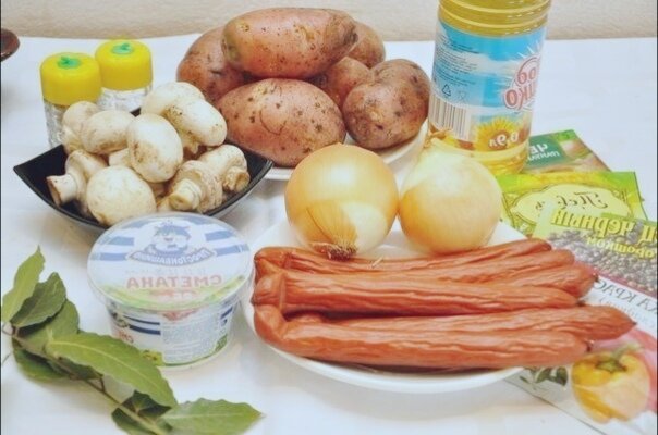 Всем привет. Готовила я сегодня в горшочках. Ингредиенты (на 4 горшочка): картофель – 1 кг, охотничьи колбаски – 6 штук, репчатый лук – 2 штуки, шампиньоны – 200 г, сметана – 1 стакан, бульон – 700 мл, сладкая паприка – 1 ч. ложка, растительное масло для обжарки, соль, перец горошком, зелень, лавровый лист по вкусу. Итак как я все это готовлю, расскажу Вам всем: Картофель я чищу от кожуры, нарезаю небольшими кубиками и чуть обжариваю в растительном масле. Лук мелко режу и обжариваю вместе с грибами. Колбаску режу кружочками. В горшочки кладу слоями: грибы с луком, охотничьи колбаски, картофель. Сметану смешивают с бульоном, посолить, поперчить и залить в горшочки. Поставить в холодную духовку и готовить при температуре 150 градусов около часа. Перед подачей посыпаю зеленью. Можно и без неё. Вкусно получается. Приятного аппетита.