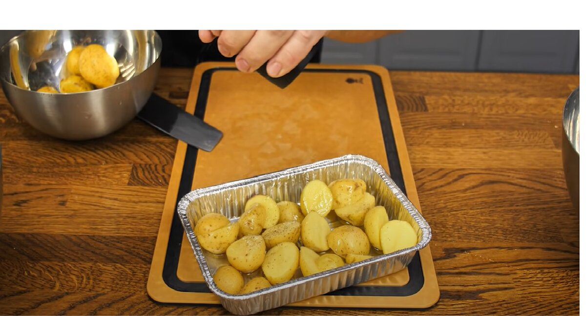 руккола Как приготовить Всё по порядку. Первым делом запекаем картофель. Для этого разрезаем каждую картофелину пополам, складываем весь порезанный картофель в емкость, добавляем немного растительного масла, солим и перчим. Готовить будем на газовом гриле. Разогреваем гриль и отправляем туда картофель на непрямой жар, температура примерно 200 градусов. Картофель будет запекаться полчаса — за это время мы успеем приготовить остальное.