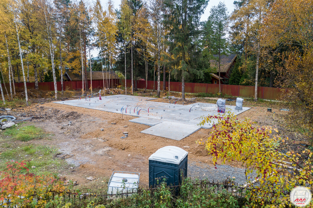 8 октября 2022 состоялась заливка фундамента УШП для одноэтажного дома из газобетона в Лисьем Носу, спустя пару дней готовая плита выглядела уже так:
