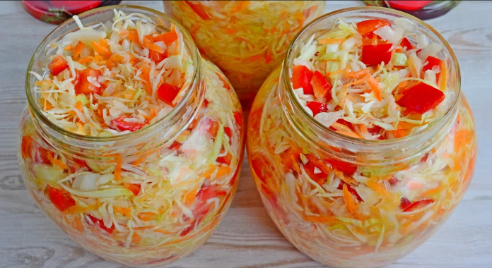 Ингредиенты : Капуста - 1,5 кг Помидоры - 500 гр Перец сладкий - 500 гр Морковь - 300 гр Лук - 300 гр Зелень укроп или петрушка - 80-100 гр Соль - 60 гр Сахар - 100 гр Растительное масло - 120 гр Уксус 9 % - 120 гр Перец горошек, перец душистый, лавровый лист Способ приготовления : Шинкуем капусту и складываем в более объёмную посуду . Далее трём морковь, можно по желанию порезать соломкой. Добавляем в капусту. Нарезаем соломкой сладкий перец. Добавляем в капусту. Лук режем полу кольцами. Добавляем в капусту. В приготовленные овощи добавляем соль, сахар, уксус, растительное масло. Начинаем перемешивать овощи, сильно уминать не нужно, только перемешать ингредиенты. Закрываем крышкой или пищевой плёнкой капусту и оставляем на 40 минут. За это время 3 раза перемешайте капусту. Далее раскладываем в чистые банки, размером 0,5 гр или 700 гр. На дно банки положите 3-4 перца горошком, столько же чёрного перца и лавровый лист. Закладываем капусту, достаточно плотно укдадываем и