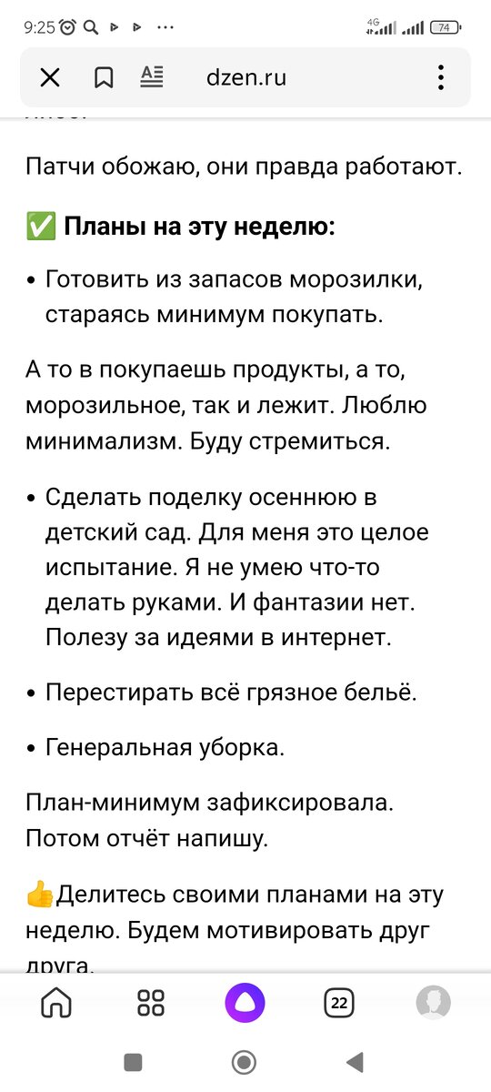 Напомню, что восстанавливалась от операции на глазах, и какое-то время был простой в режиме, питании и, в-общем, в ЗОЖ. С прошлого понедельника вливаюсь в в струю. 👇План-минимум был такой: Что по факту: Плюс к расхламлению и экономия! 2. С поделкой тоже получилось. Села и сделала. Оказывается, не так страшны поделки в детский сад. Семейное творчество, и ребёнок что-то поделал? 3. Бельё грязное безжалостно превращено в чистое. Уложено в шкаф и вкусно пахнет. 4. Уборка сделана, была у меня "чистая среда". Что-то даже удалось выбросить. ☀Дополнительные дела сверх плана: Планы на эту неделю(17.10-23.10) 🍁Сегодня хмурое осеннее утро. Ливень. Но вместо зарядки решила прямо с утра прогуляться под дождём🌧. Взяла кофеёк, и подышала. 💃💃💃Иду вершить дела! Как вы сегодня? Строите планы на неделю? Давайте делиться! 📝📝