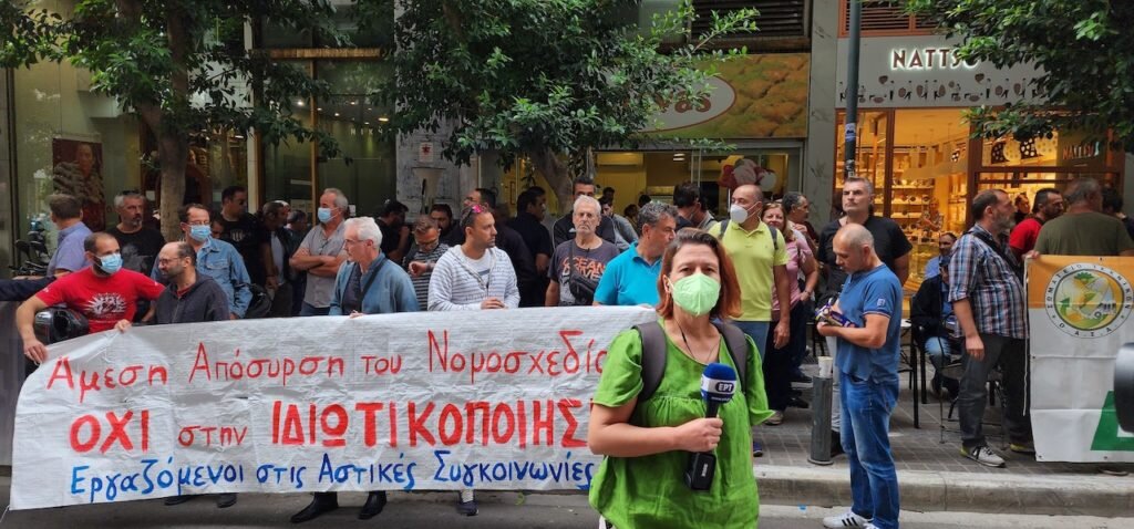 21 сентября работники общественного транспорта греческих Афин объявили забастовку против нового закона, который фактически означает приватизацию этого самого транспорта, а также значительно урезает трудовые права. Новый закон открывает путь к полной приватизации государственных компаний и общественной инфраструктуры. Забастовка работников общественного транспорта в Афинах/ фото LiberationNews Принятие его сразу же позволяет двум основным компаниям сферы общественного транспорта ввести двухуровневую систему оплаты труда и поднять цены на проезд. Все это на фоне исторического уровня инфляции и роста цен. Для рабочих же этот закон означает ликвидацию полной занятости и бессрочных контрактов. 24-часовая забастовка, объявленная днем ранее Афинским центром труда (EKA) (региональная федерация профсоюзов), затронула работу городского метро, троллейбусов и автобусов. В полдень около 200 работников транспорта и лидеров оппозиционных партий Греции собрались у здания министерства финансов. EK