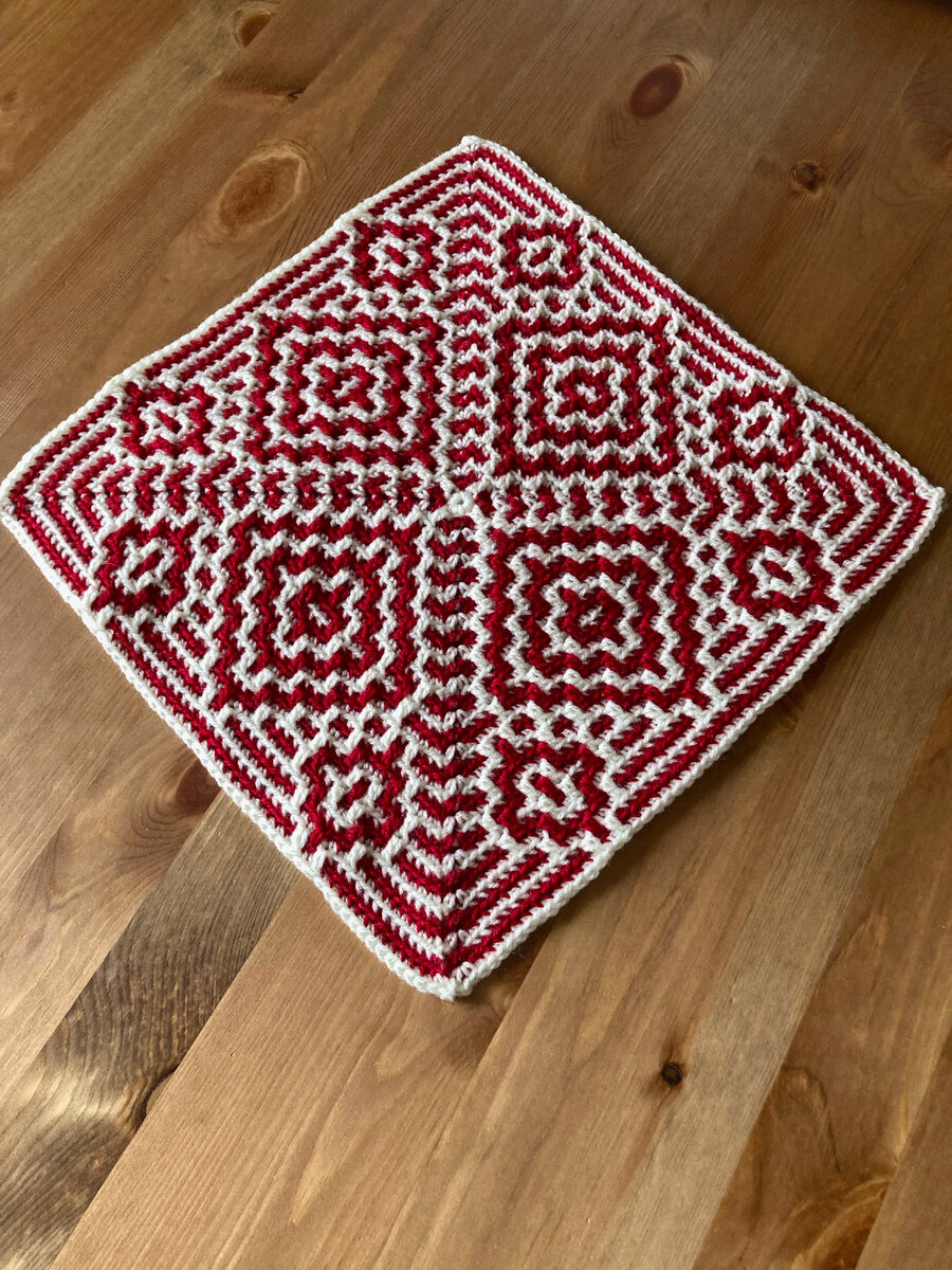 Для этого квадрата выбрала пряжу белого и красного цветов, получилось довольно неплохо, мне понравилось. Хотела добавить ещё несколько рядов с маленьким квадратиком, что в центре большого квадрата, но не стала, мотив показался мне слишком большим, решила на этом остановиться.
