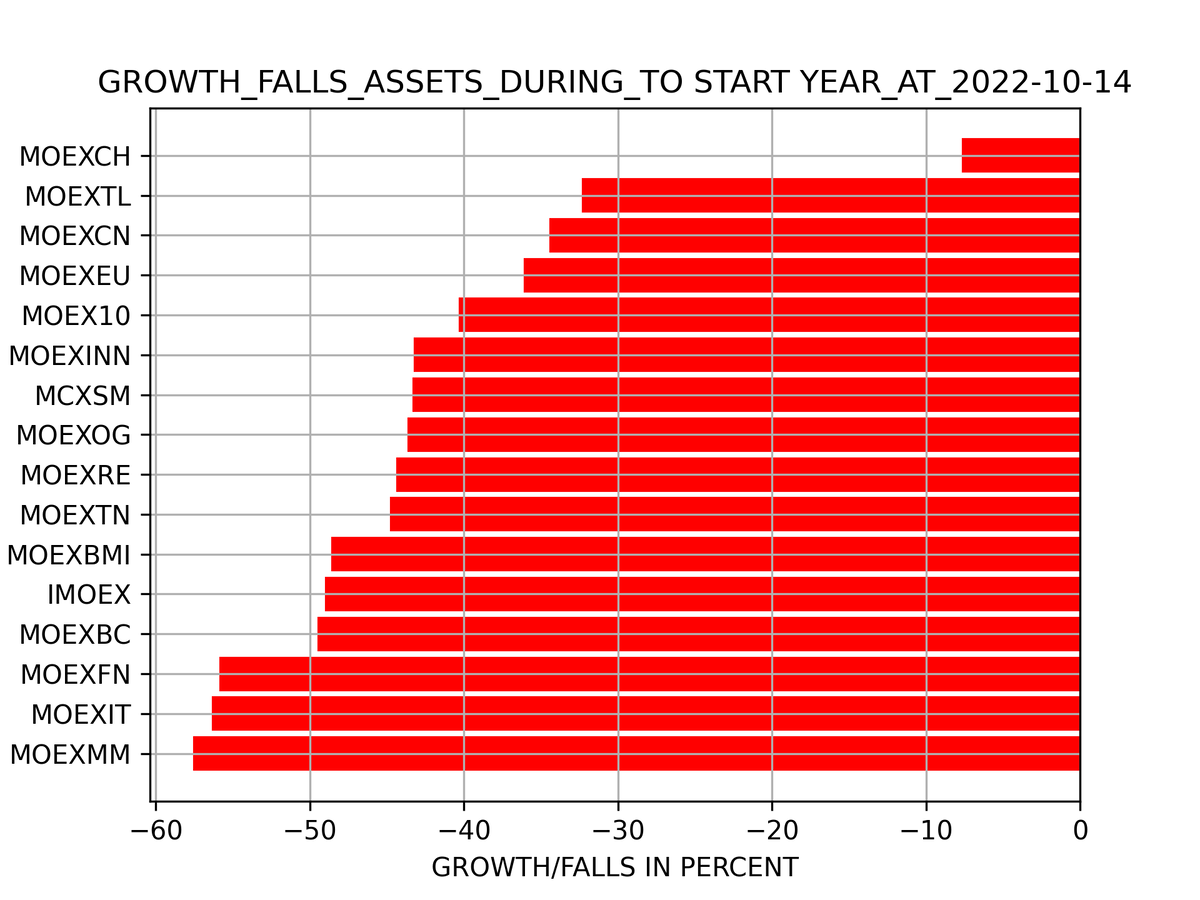 Доходность посчитана на срок: ✅ неделя ✅ 1 месяц ✅ 1 квартал ✅ Полгода ✅ 9 месяцев ✅ 1 год ✅ к началу года Активы представленные в расчете: ✅ IMOEX – основной индекс MOEX ✅ MOEXBMI – индекс широкого рынка, включает 100 компаний ✅ MOEX10 – индекс 10 самых ликвидных компаний ✅ MOEXBC – индекс голубых фишек ✅ MCXSM – индекс компаний малой и средней капитализации Отраслевые индексы: ✅MOEXOG - нефть и газ ✅MOEXEU - электроэнергетика ✅MOEXTL - телеком ✅MOEXMM - металлы и добыча ✅MOEXFN - финансы ✅MOEXCN - потребительский сектор ✅MOEXCH - химия и нефтехимия ✅MOEXTN - транспорт ✅MOEXIT - IT сектор ✅MOEXRE - строительные компании ✅MOEXINN - инновационные компании