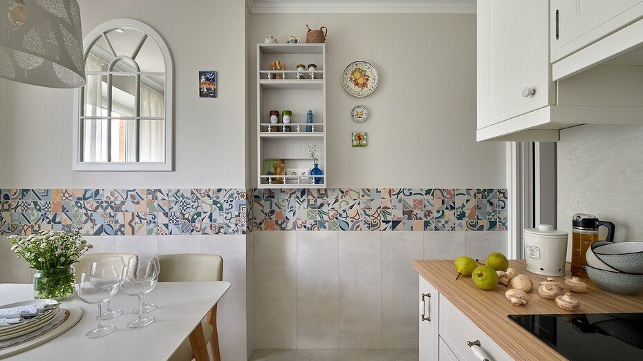 На кухне оформили плиткой не только фартук (что традиционно), но и половину стены в обеденной зоне. Это сделано для практичности, чтобы обеденные стулья не повредили краску, но еще такое решение добавило декоративности.