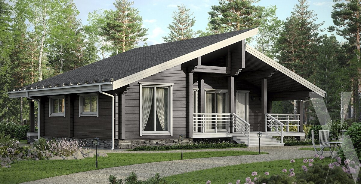 Общая площадь: 91 кв.м. Размеры дома: 13 x 10 м. Современная финская архитектура славится на весь мир своей лаконичностью, практичностью и естественностью, благодаря чему пользуется неослабевающим спросом. Финляндия – страна северная, поэтому при создании домов особое внимание уделяется утеплению, а точнее – теплоизоляции и энергоэффективности. Профилированный клееный брус, из которого выполнены стены этого дома, является экологичным материалом, имеющим хорошие теплоизоляционные свойства и привлекательный внешний вид. Такие стены можно дополнительно не утеплять и не отделывать. Изготавливается брус из качественной древесины хвойных пород и проклеивается нетоксичными составами. Дом имеет красивую и лаконичную современную форму и соответствует всем традициям финского домостроения. Однако сейчас, благодаря новым технологиям, у финнов очень распространены и каркасные дома. В покраске и цвете кровли выбраны оттенки серого, что придаёт дому немного строгости и солидности. Но палитру можно вы