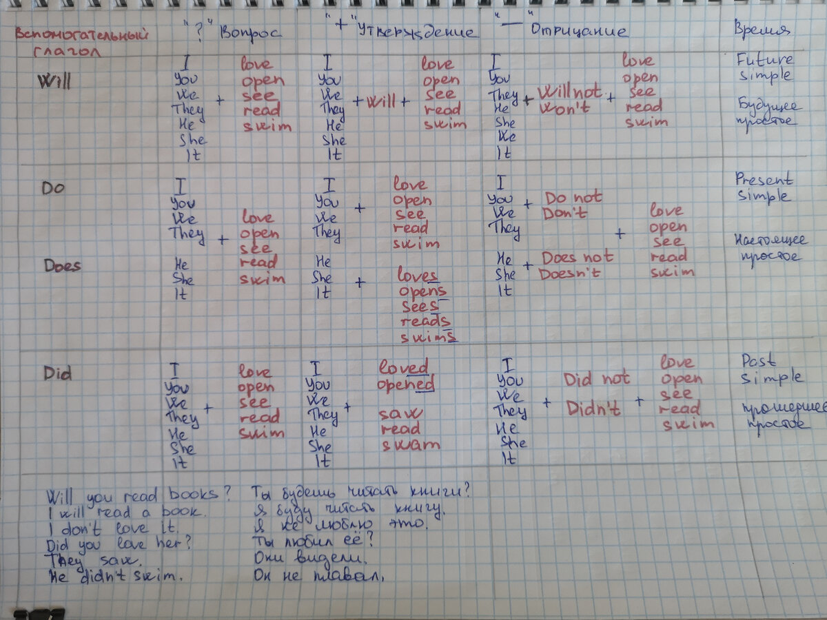 Решила делиться своими таблицами, которые я делаю при изучении английского языка. Они помогают мне наглядно запоминать и применять их на практике. Если у Вас есть полезные таблицы, прикрепляйте в комментариях, будем делиться полезной информацией и помогать друг другу изучать язык. Первое чем я хотела поделиться - это построение простых предложений в прошедшем, настоящем и будущем временах. Необходимо запомнить вспомогательные глаголы при построении предложений: В прошедшем - Did В настоящем - Do (для I, You, We, They) и Does (He, She, It) В будущем - Will. Отрицание строится путем добавления - not. Did not (сокращенно - Didn't), Do not (Don't), Does not (Doesn't), Will not (Won't). Will меняет свою форму в отрицании на Wo'. При этом, также стоить отметить, что в большей части случаев глаголы не меняют своих форм, но есть два исключения когда это происходит. Настоящее время при He, She добавляется -s. He loves, She opens. И в прошедшем времени, когда действие на 100% завершено, глагол