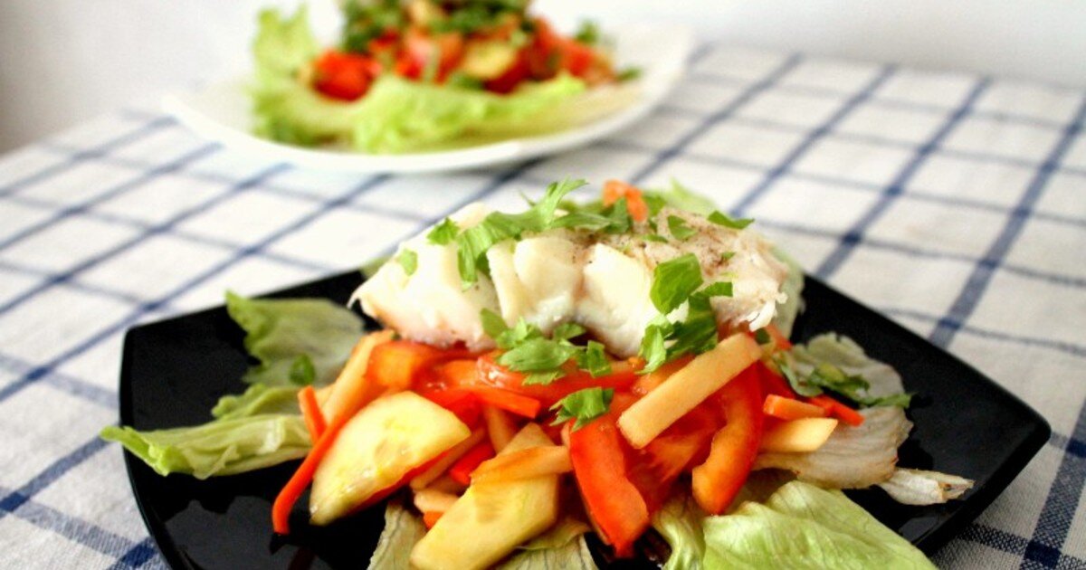 500 г копченой рыбы (зубатки, палтуса, трески ), 2 яблока (некислых), 2 соленых огурца, 2 свежих огурца, 3 помидора, 2 ст ложки рубленого зеленого лука. Острый соус: 1/2 стакана растительного масла, 1 ч ложка горчицы, 2 ч ложки сахарного песка, 3ст ложки уксуса, соль на кончике ножа. Очищенную от кожи и костей рыбу, яблоки, огурцы, помидоры (семена из помидоров удалить) нарезать кубиками, все перемешать, добавить рубленый зеленый лук и залить острым соусом.