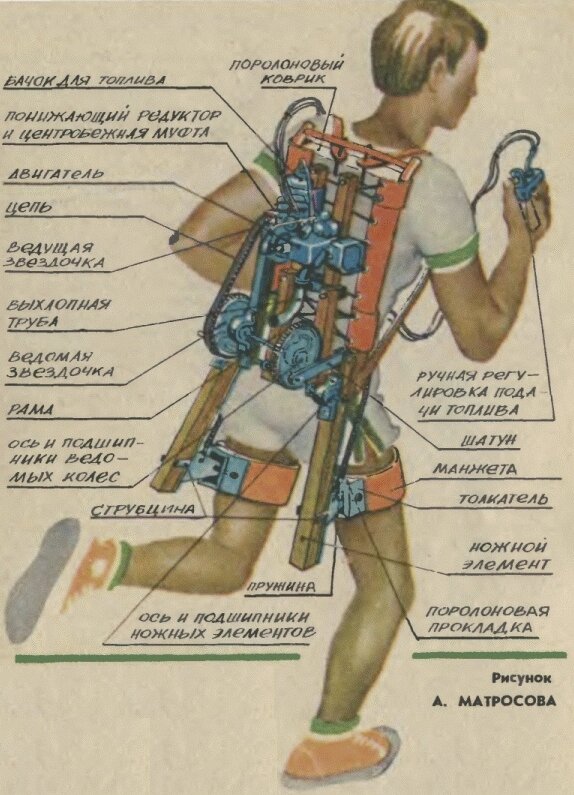 (статья из журнала "Юный техник" за 1981 год, №5) Много на свете разных машин, с помощью которых мы ездим, плаваем, скользим, даже парим на воздушной подушке. А нельзя ли сделать машину, напоминающую сказочные сапоги-скороходы, чтобы она не возила нас на себе, а лишь помогала бежать без устали? Предлагаем познакомиться с такой машиной, которую иначе и не назовешь, как самобегом. Придумал ее американский изобретатель Берт Шульман. Возможно, вид человека с таким агрегатом за спиной на первый взгляд покажется вам несколько неказистым. Тем не менее благодаря этому "рюкзаку" можно, что называется, "на своих двоих" развивать скорость до 30 км/ч, не чувствуя при этом особой усталости. Силовая основа самобега - маленький бензиновый двигатель, такой, как на мопедах и легких мотоциклах. А движущие элементы - две деревянные или пластмассовые "ноги" с толкателями. Они-то и помогают бежать. Как же приводятся в движение толкатели? Под двигателем монтируется своеобразная цепная колесно-кривошип