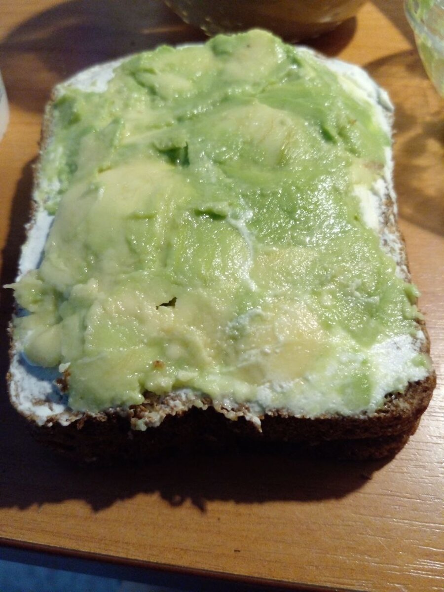 Недавно я увидела одно короткое интервью типа блиц опроса, где певица Валерия, думаю все знают кто это и что она ест только пп продукты, и ведет здоровый образ жизни, говорила про свой любимый завтрак. Мне стало интересно и я вдруг подумала, а почему бы и не попробовать тоже. Правда если честно такие продукты как авокадо я очень очень редко беру, потому что считала их дорогими и не разрешала покупать их себе. Но в этот раз подумала , а что тут такого, мне одной много то не надо и вот купила две штучки в упаковке. Её любимый завтрак состоит из бутерброда с намазкой сырного крема и сверху авокадо. Хорошо что мякоть авокадо так легко отделяется от кожуры, прям ложечкой я быстро вынула всю мякоть. потом намазала на бездрожжевой хлеб сырный крем. До этого налила себе кофе с молоком. Конечно не совсем красиво получилось, но я же не в ресторане, так что вполне сносно и вуаля бутер от Валерии готов. Наверно для таких как я это очень полезный бутер, прям пп точно,ведь многие трубят о том как по