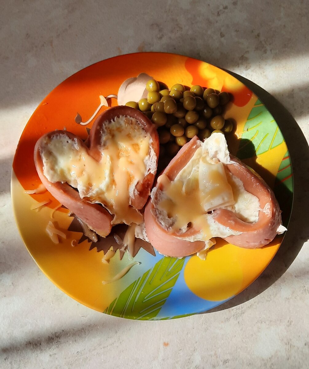 Самое сложное было сделать сосиски в виде сердца, ведь она начинала разваливаться на сковородке. Тогда я решил скрепить их зубочистками и вуаля все получилось. Внутрь сердца разбиваем яйцо и жарим до готовности. Сверху посыпал сыром.