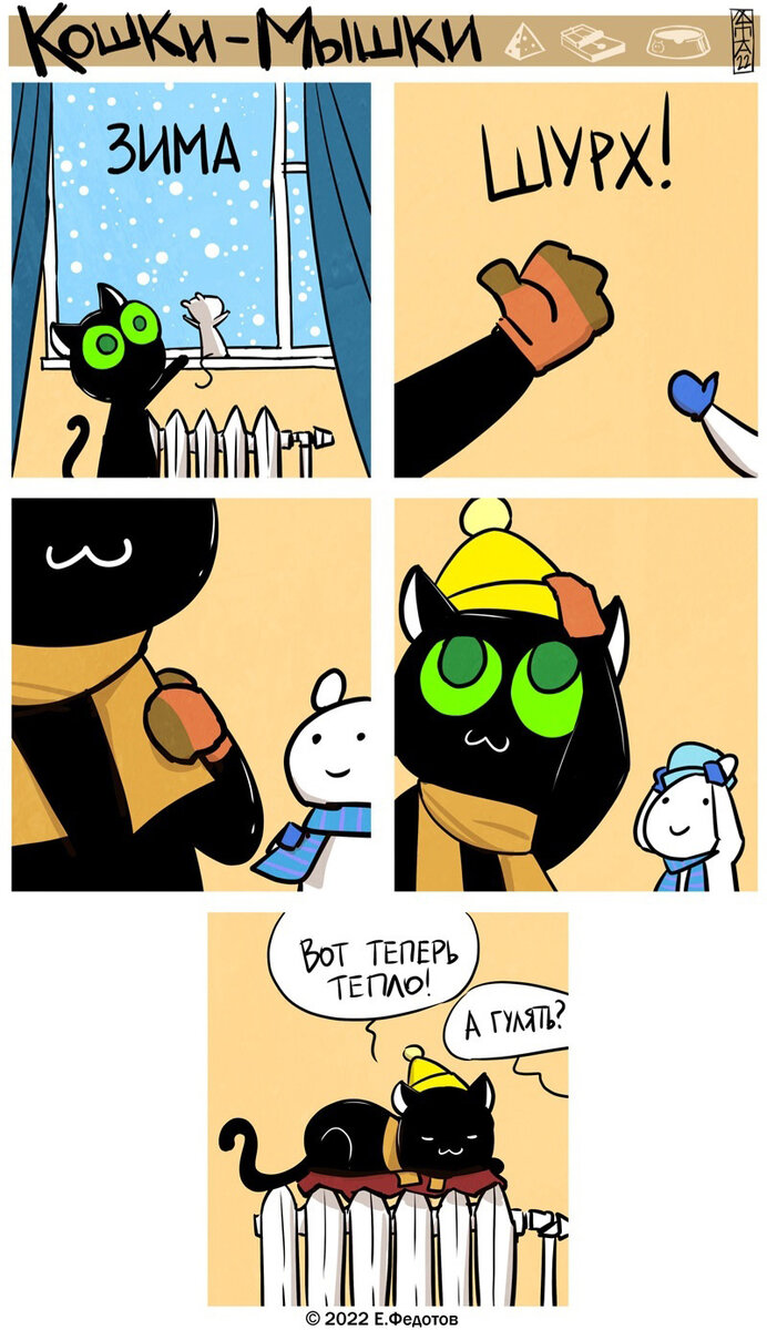 Вот и наступила календарная зима, а это значит, что в моем блоге наступило время для зимних тематических подборок! Обычно я стараюсь встречать наступление каждого времени года подходящими комиксами, так что сегодня вас ждут шутки про снег, холода, лепку снеговиков, катание на коньках и многое другое. А потом глядишь уже и до предновогодних подборок будет не далеко! Один из комиксов серии Кошки-Мышки российского художника Евгения Федотова посвящен наступлению зимы. Главные герои данного проекта - те самые кошки и мышки - решили встретить наступление холодного времени года в своем стиле. Румынская художница Кассандра Калин (Cassandra Calin) является автором серии Cassandra Comics («Комиксы Кассандры»). По сути, это во много автобиографичный проект - Кассандра рисует комиксы о себе и поэтому всегда старается подмечать забавные вещи, происходящие вокруг. У меня тоже есть парочка комиксов на тему зимы - все-таки живу я в северном городе, поэтому и зимние холода для меня уже давно стали прив