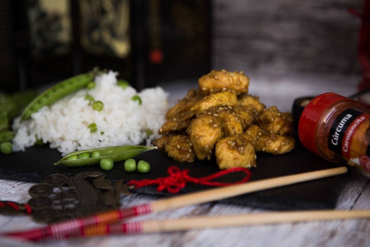 Ингредиенты: - Куриное филе - 500 г. - Имбирь - 5 г. - Куркума - 10 г. - Кунжут - 15 г. - Растительное масло - 1 ст. л. - Мёд - 2 ст. л. - Соевый соус - 4 ст. л. - Чеснок - 4 зубчика 🧑🏻🍳 Приготовление: 1. Куриное филе промыть, нарезать на небольшие кусочки, поперчить, добавить имбирь, куркуму и залить соевым соусом. 2. Пропустить чеснок через чеснокодавилку и добавить к курице. Перемешать всё и оставить мариноваться на 30 минут. 3. Разогреть на сковородке растительное масло и мёд. Как только мед растает, аккуратно перемешать. 4. Добавить туда курицу и жарить на медленном огне до золотистой корочки. За пару минут до готовности посыпать всё кунжутом, перемешать и ещё немного обжарить