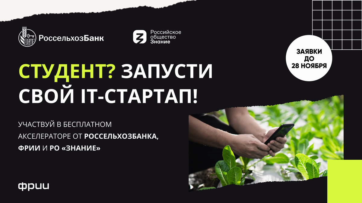 С 7 декабря 2022 по 7 февраля 2023 года студенты, аспиранты и научные сотрудники российских вузов смогут протестировать свои идеи и запустить собственный агротех-стартап в акселераторе при поддержке Россельхозбанка, ФРИИ и Российского общества «Знание». Россельхозбанк в партнерстве с ФРИИ и Российским обществом «Знание» начал прием заявок от студентов российских вузов на участие в студенческом агротех-акселераторе. Участие смогут принять студенты старших курсов бакалавриата, специалитета или магистратуры, а также аспиранты и молодые ученые, у которых есть инновационные решения для развития технологий и сервисов на платформах экосистемы «Своё» от РСХБ или идеи по запуску своего агротехнологического стартапа. В акселератор могут пройти также участники, которые обладают высокими компетенциями и мотивированы на работу в агросекторе. Избранные IT-решения будут внедрены в инфраструктуру банка для улучшения пользовательского опыта клиентов экосистемы «Своё». Самые талантливые участники акселе