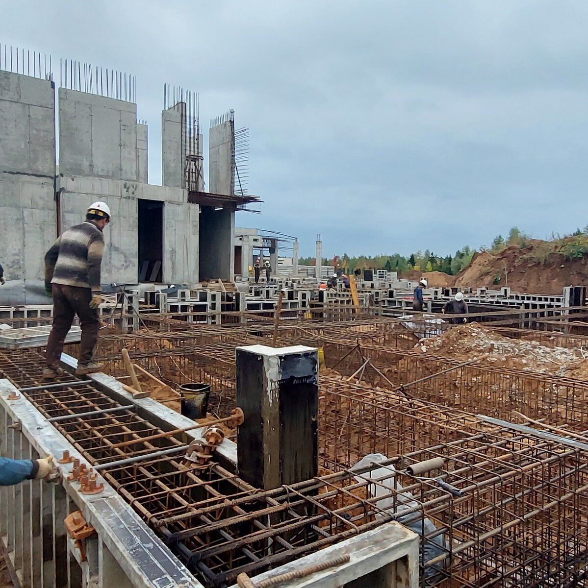 В премиальном коттеджном поселке Миллениум Парк продолжается строительство двухэтажной виллы с гаражом и бассейном по проекту архитектурного бюро SL Project. В октябре завершены: — Работы по бетонированию 2-ой и 3-ей захватки монолитного ростверка раствором В25 Инком-Бетон. Добавление в состав пластификаторов увеличило его подвижность и пластичность до уровня П4 — это идеальный вариант для подачи с использованием бетононасоса Putzmeister. Такой раствор не образует пустоты в арматурном каркасе, легко уплотняется и обеспечивает высокие прочностные характеристики всей конструкции. — Демонтаж опалубки монолитного ростверка 1-й, 2-й и 3-й захватки. — Обмазочная гидроизоляция ростверка битумной мастикой №1 @technonicol. — Обратная засыпка пазух фундамента. — Монтаж пустотных железобетонных плит перекрытия цоколя и 1-го этажа . — Работы по армированию монолитных колонн и пилонов 1-го этажа. — Монтаж щитовой опалубки монолитных колонн и пилонов 1-го этажа с параллельной установкой прогревочных
