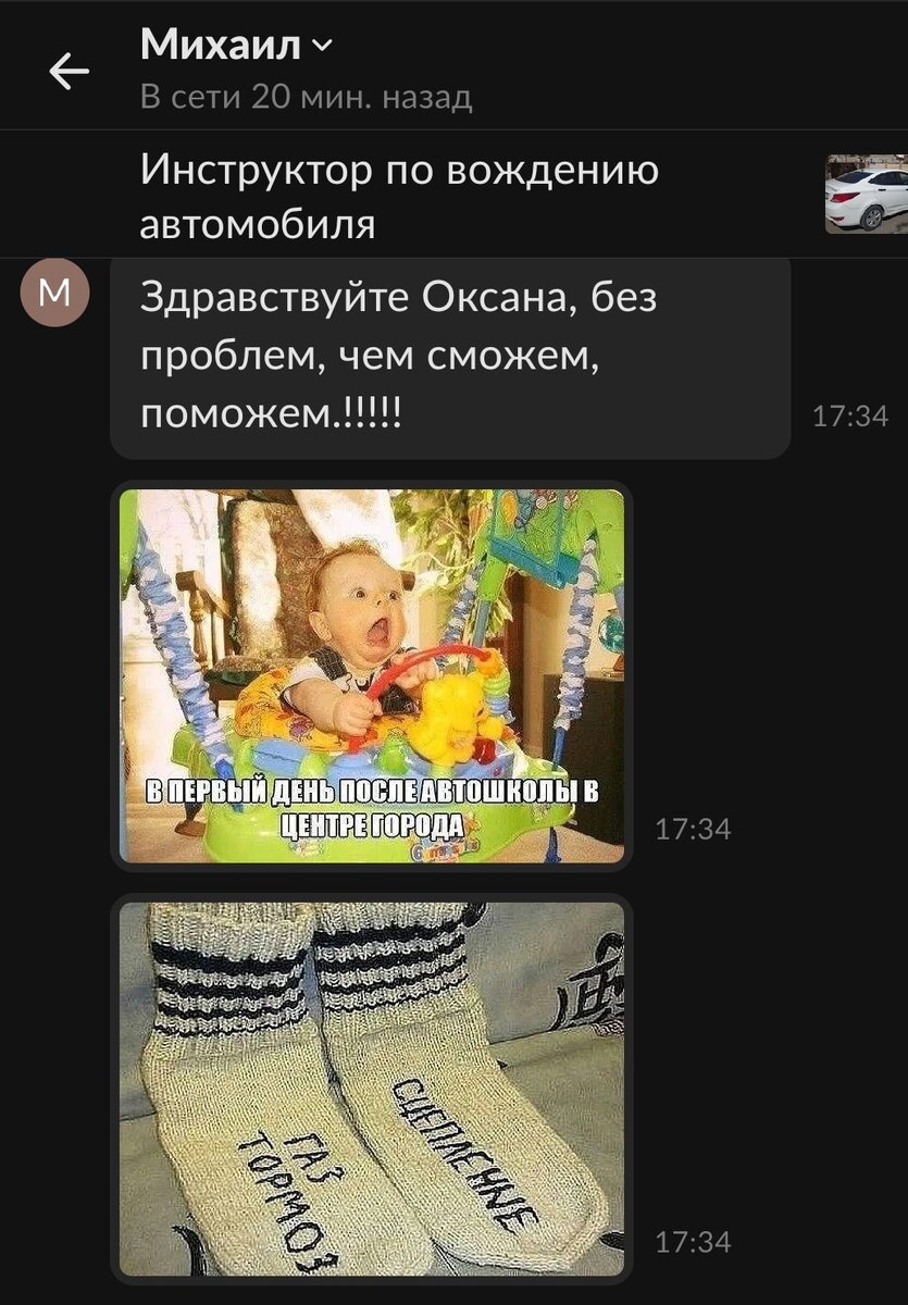 Ещё в субботу вечером через Авито нашла двух инструкторов по вождению: мужчину и женщину. Написала обоим сообщения и стала ждать ответа. Конечно, мне хотелось, чтобы быстрее откликнулись женщина. Мне кажется мы бы поняли друг друга. Солидарность что ли... А мужчины, скорее всего, предвзято относятся к женщинам за рулём. Хотя сейчас количество автоледи растёт, как снежный ком. Но вечером воскресенья на связь вышел мужчина. Сразу видно, что Михаил с чувством юмора. Это хорошо. Сегодня договорилась с ним пока о 2-х занятиях: С собой взять кроссовки и хорошее настроение. Круто! Быть честной, немного страшно. Скорее волнительно. И чужой мужчина рядом и будто экзамен сдавать буду. Но мне это нужно! ЭТО нужно МНЕ! Мужу сказала. "Ну, вот началось."-говорит.🤣🤣🤣 Так что завтра я буду полна эмоций и адреналина. Вот кто мешал мне водить наше авто, когда был муж дома? Никто. Принципиальная была. Благодарный пассажир. А теперь... Ничего, выходить из круга комфорта тоже нужно. Даже полезно. Новые