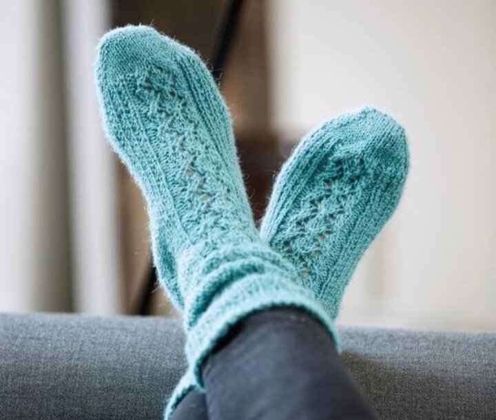 Очаровательные носки с полосой ажурного узора хорошо согревают и при этом выглядят нжно и воздушно.