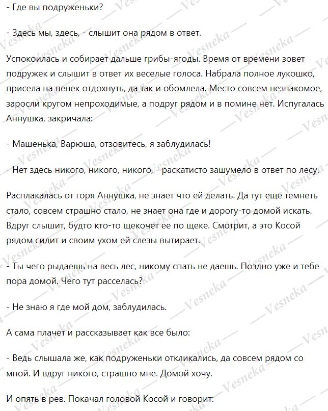 Сказочный привет всем! Собралась как-то раз Аннушка с подружками в лес по грибы-ягоды. Ходят по лесу ягоды собирают, разговаривают друг с другом. Да так увлеклись, что не заметили как разбрелись по всему лесу. Вспохватилась Аннушка, закричала: - Подружки ее сами чуть не заблудились, а пока я их из лесу выводило, Аннушки и след простыл. А она уж в ваши крайние владения забралась, - пыталось оправдаться Эхо. Недолго думая Аннушка распрощалась с Радугой и направилась домой. С помощью подарка Феи и Эха выйдя из чащи, она очень быстро нашла знакомую тропинку и вприпрыжку побежала к уже видневшемуся своему дому, где ее ужа давно заждались родители. Тут и сказочки конец, а кто дочитал, того люблю. ПыСы. Эта детская сказка была написана мной и дочерью давным давно. Теперь и вы её прочитали)) Как сказки правду искали Зимовий - Змей Горыныч Ах Царевна Несмеяна, грустные глаза Русалочка, ты ли это... Кощей Бессмертный. Рождение Свадебный подарок для Кикиморы Две туфельки 35-го размера. Бриллианто
