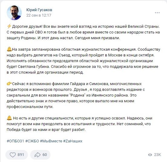 22 сентября 2022 года белгородский журналист Юрий Гусаков в торжественной обстановке сообщил, что его призвали стать на защиту Родины. Он, дескать, "с первых дней был готов вместе со всем народом стать на защиту Родины - и этот день настал". В комментах, понятно, слёзы домохозяек, восхищение мужественностью, пожелания возвращаться с Победой, все дела. 28 сентября Юрий отбомбился очередной термоядерной порцией патриотического пафоса, бытописуя неделю в казарме, проведенную с такими же, как он, Настоящими Мужиками, ставшими на Путь Воина. А еще через пару недель, 13 октября, Юрий, как бы промежду прочим, сообщил, что он после работы заезжал проведать семью мобилизованного белгородца. Поскольку сам Юрий не потрудился объяснить, каким образом за столь короткий срок он прошел весь Путь Воина и счастливо воротился домой (разумеется, с Победой), то об этом, замучившись ждать объяснений, у него деликатно поинтересовались в комментариях. Я присоединился к расспросам, ну и, как и сл
