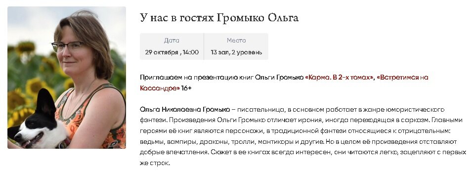 Но все познается в сравнении: и они читались влет, пусть и всего где-то до часу ночи. А поскольку встречами с поклонниками белорусская писательница нечасто балует даже своих соотечественников, не говоря о москвичах, пропустить данное мероприятие я никак не могла, мужественно преодолев свою законную и исстари сложившуюся Суботнюю Лень. Кажется, в последний раз в Москве Ольга Громыко выступала аж в 2016.