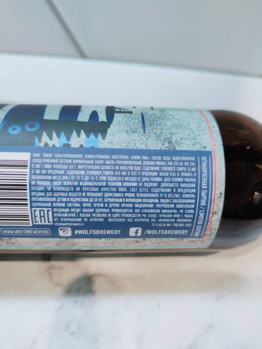 Подписывайся на канал, что бы не пропустить новые публикации каждый день! Обзоры на пиво, новости из мира пива и многое другое здесь! Изготовитель: ООО «Губахинская пивоварня», Пермский край, город Губаха. Состав: Вода подготовленная, солод ячменный светлый, карамельный, сахар, хмель гранулированный, дрожжи пивные. Плотность 23%, крепость 13% IBU 25 Тип брожения: Эль (Ale) Сорт: Крепкий Британский Эль (Strong British Ale ) Стиль: Английский Барливайн (English Barley Wine) Цена: +-250р Пиво куплено в Челябинске, в крафтовом барчике на Кировке под названием "Патрик", объем 0,33 литра. Описание: Барливайн «Синяя Яма» результат коллаборации Губахинской Пивоварни с Волковской Пивоварней. Вкус вино-портвейный. Дегустация: Пенная шапка отсутствует, даже попыток не было подняться. Карбонизация ниже среднего. Цвет тёмный, коричневый, мутное, не прозрачное пиво. В аромате сухофрукты, чернослив, немного кофе и шоколада, карамельный солод, капля копчености и жженки, со временем аромат меняется т