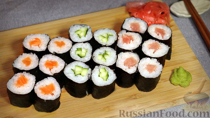 Представляю Вашему вниманию рецепт приготовления самых простых суши-роллов - маки (норимаки). Данные роллы я рекомендую к приготовлению людям, которые никогда до этого не сворачивали роллы самостоятельно. На мой взгляд, маки - это именно те роллы, с которых надо начинать приготовление данного блюда новичкам. В этом рецепте я привел базовые начинки: лосось, тунец и огурец. Продукты